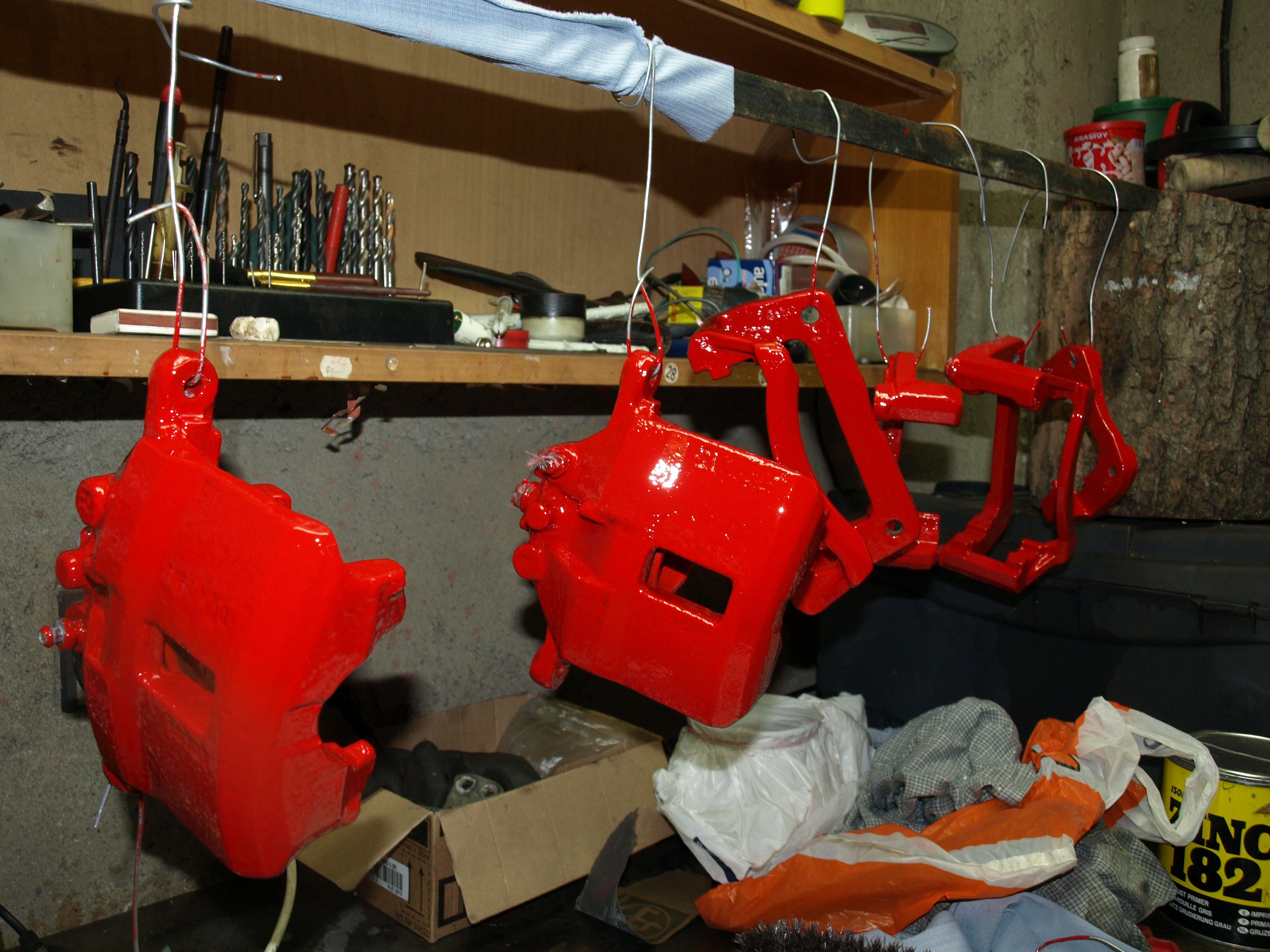 Je to celkem makačka, ale už to mám v podstatě hotové. Namíchal jsem asi 2/3 barvy a zbylo mi něco, tak jsem narychlo odmastil a odstrojil ten jeden zadní menší třmen a natřel ho taky... najím se a půjdu ho natřít po druhé