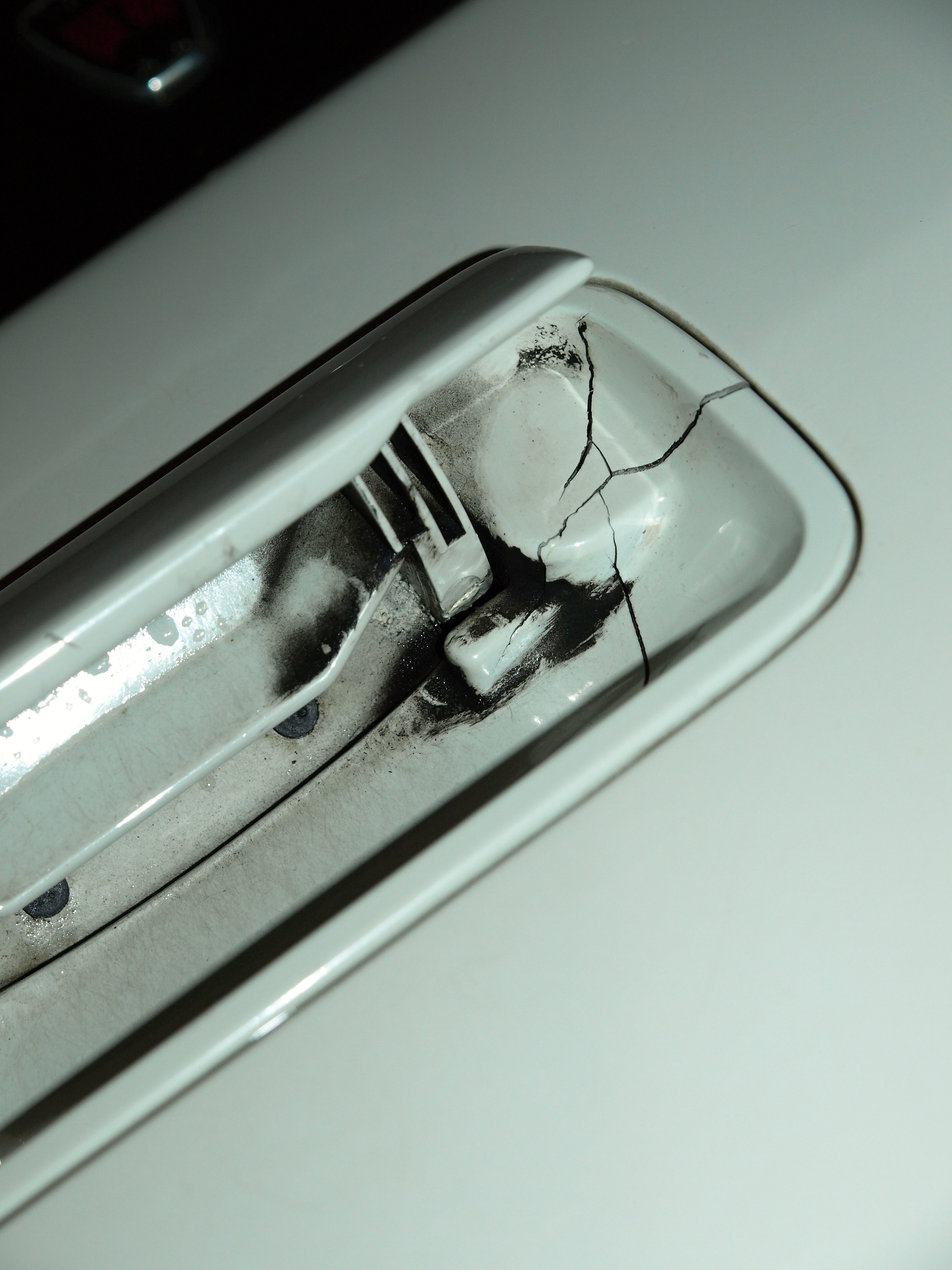 Tedy křuplá byla už před rokem, ve středu byla křuplá viz. foto a dneska už to dokřuplo tak, že jeden z těch klínků vypadl. No mufna v klice začala rezivět, nabobtnala a tím se to roztrhlo. Chvilku jsem se mordoval s tím, jak kliku vyndat ven, ale nakonec pomohlo povolit i zámek, ten umožnil táhlu jít níž a pak šla klika ven. A tak jsem to pájkou z druhé strany svařil. Drží to pěkně (už v tom mám celkem praxi