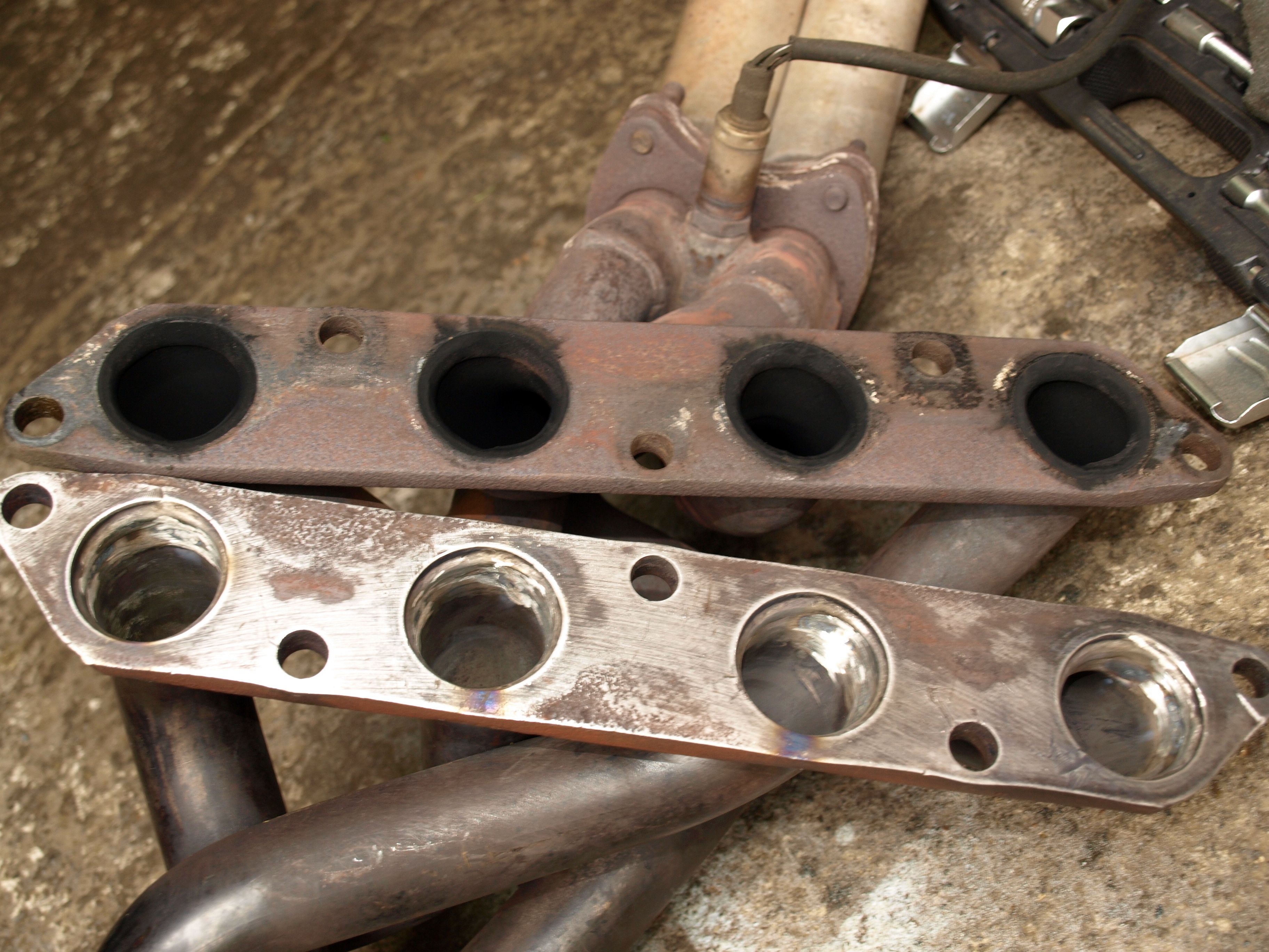 Všechno celkem pěkně odsejpalo. Kamarád mi už včera obodoval trubky na svodech. Spolu jsme odměřili novou část výfuku vůči střednímu dílu, který byl potřeba zkrátit až téměř k tlumiči. Bohužel ta restrikce je tam brutální (viz. foto). Dvoj dírová příruba na katu měla rozteč 10 cm, takže jsem na půdě vyštrachal jakýsi starý první díl a z něho ufiknul přírubu i s kusem trubky, která se navlékla na trubku středního dílu. Tím jsem mohl nastavit optimální délku a úhel a nabodovat. Po sundání středního dílu se nám díky tomu podařilo tu restrikci udělat aspoň trošku pozvolnou. Nicméně je to šílený rozdíl v průměrech trubek, takže ten střední díl to fakt bude chtít sehnat brzy.