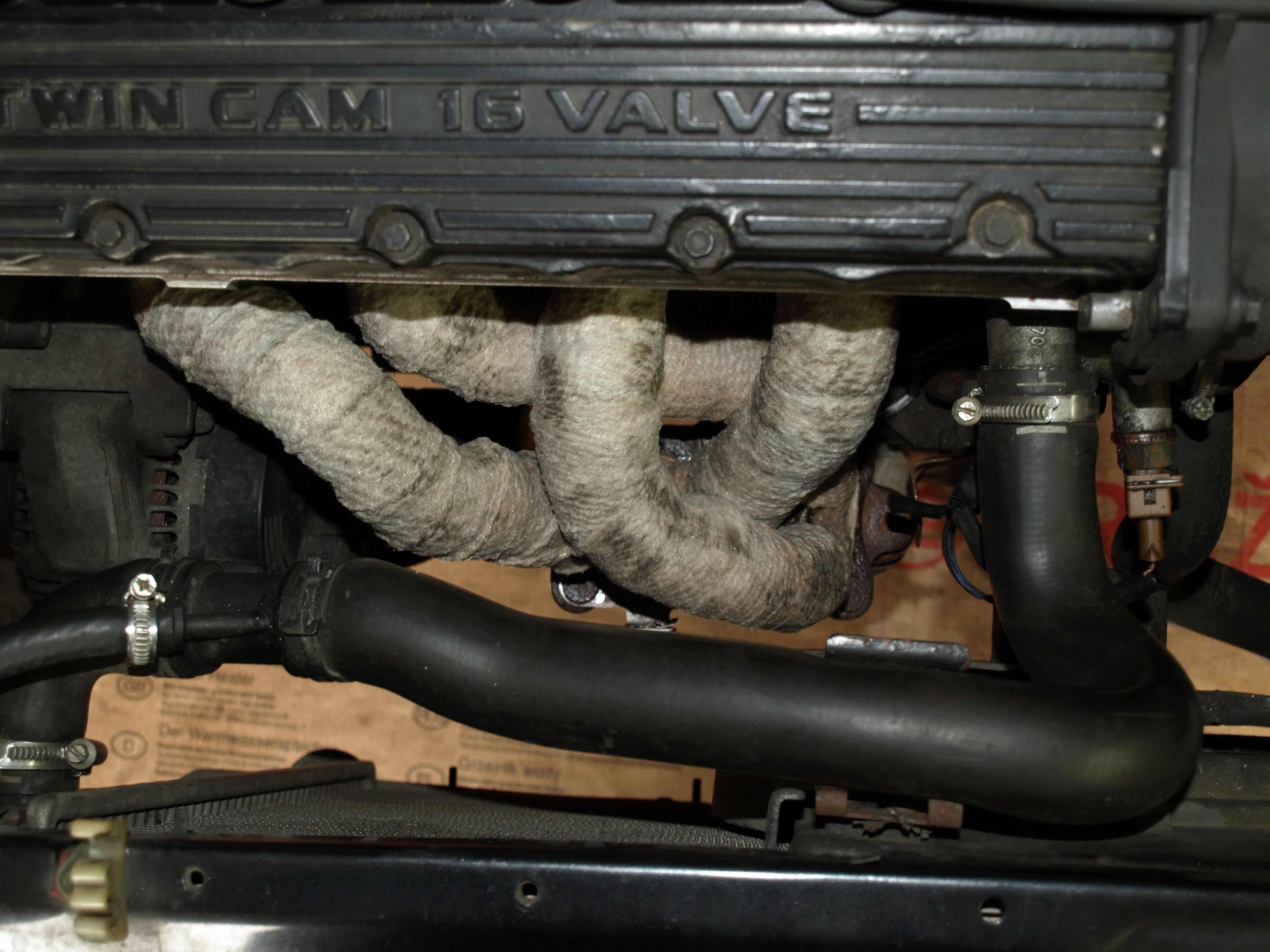 Omotal jsem svody a část prvního dílu od svodů. Po té jsem to řádně nacucal vodním sklem no šlo se na montáž. Byl celkem mor sám pod autem na špalkách se mordovat s těma těžkýma trubkama, ale podařilo se. Smontováno bylo a tak jsem si dopřál prvního nastartování a čoudu z omotávky