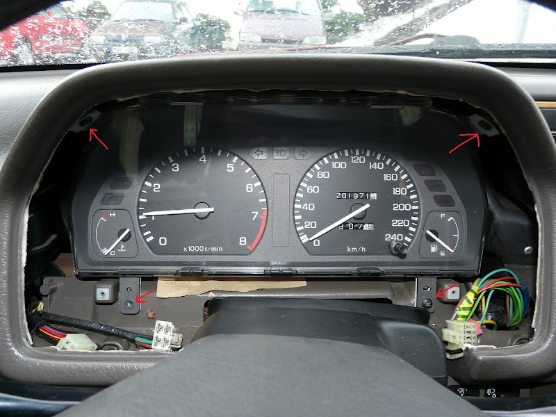 7. Budíky jsou venku, tak z nich odmontujte horní dvě plechové packy a sundejte přední kryt.