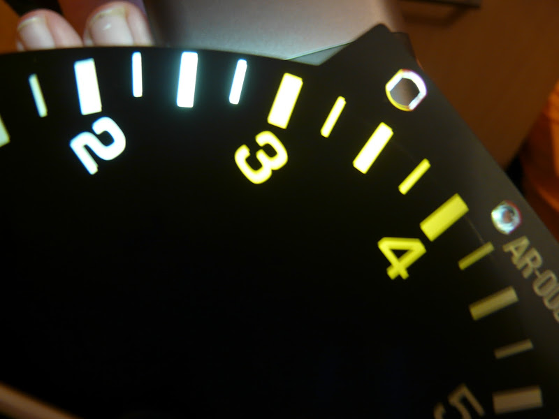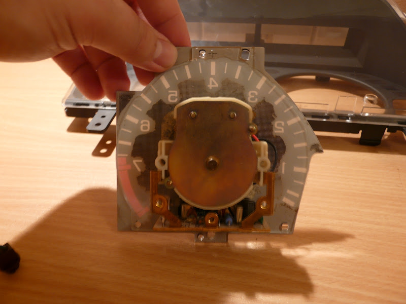9. To nejhorší. Budíky mají dvě vrstvy - jedna je plexi asi k rozložení světla a na ní je potisklá destička, která má ze zadní strany takovou malou vrstvu, která zbarvuje popisky do žluta a je k tomu plexi na malém místě přilepená. Použil jsem ulamovací nůž a odlepil je od sebe, odlakovačem na nehty jsem tu zadní stranu trochu potřel a podle toho kolik jsem měl místa jsem to buď strhnul nehtem, nebo seškrábal nožem. Odlakovač to jakoby změkčí a nebo úplně strhne. Mezi oběma destičkama a hlavně v místech popisků nesmí zůstat žádný bordel, jinak to bude vidět!