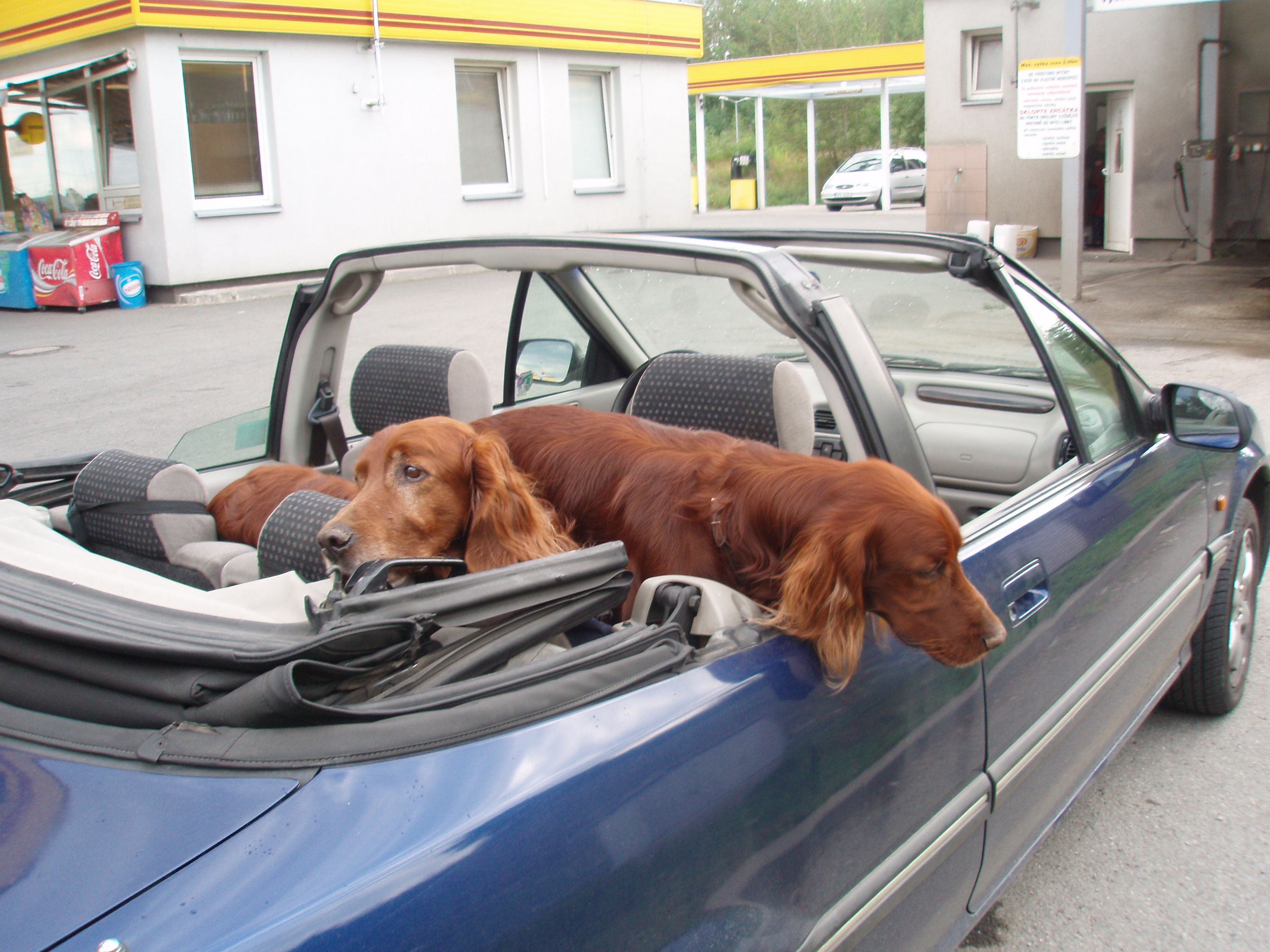 Nevím proč jsem si myslel, že na vožení psa je nejlepší kombi, jak vidím jde to i v kabriu. Mimochodem Karle moc pěkní irští setři mir: