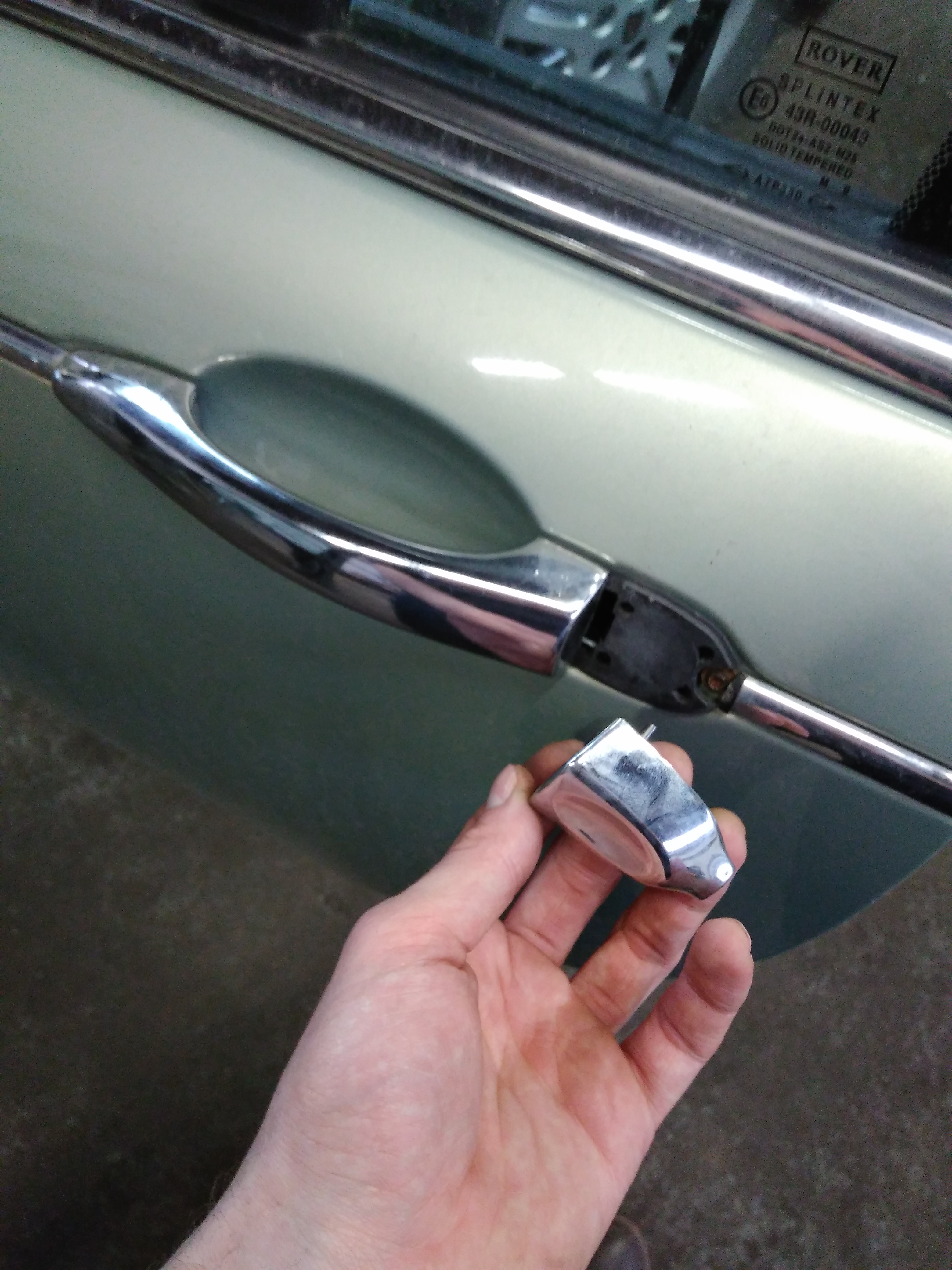 2.v levé části dvěří je potřeba odpojit táhlo vedoucí z kliky do zámku. Je to v takovém bílém plastovém otevíracím uložení - šroubovákem otevřít a vycvaknout táhlo 3. Je potřeba sundat malý chromový díl vnější kliky .