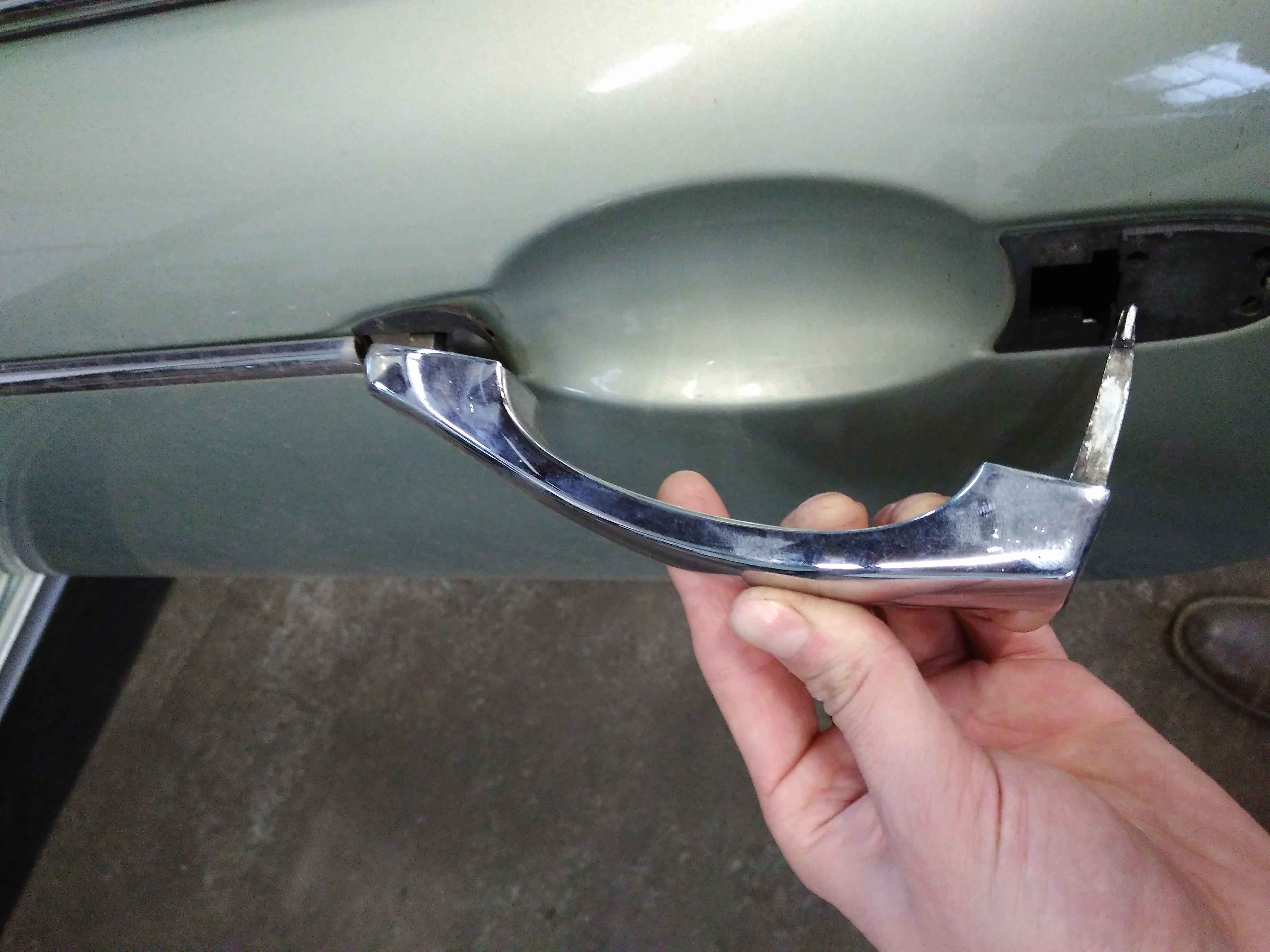 4. Poté co sundáte malý kousek chromu, zatáhnětě za vnější kliku a pohybem do strany jí vysunete ven. 5. Pak na vás vykoukne jeden torx. Druhý je pod gumovým těsněním. 6. Po povolení je možné vyndat vnitřní díl kliky ven. Poté v něm uvidíte původce všeho zla