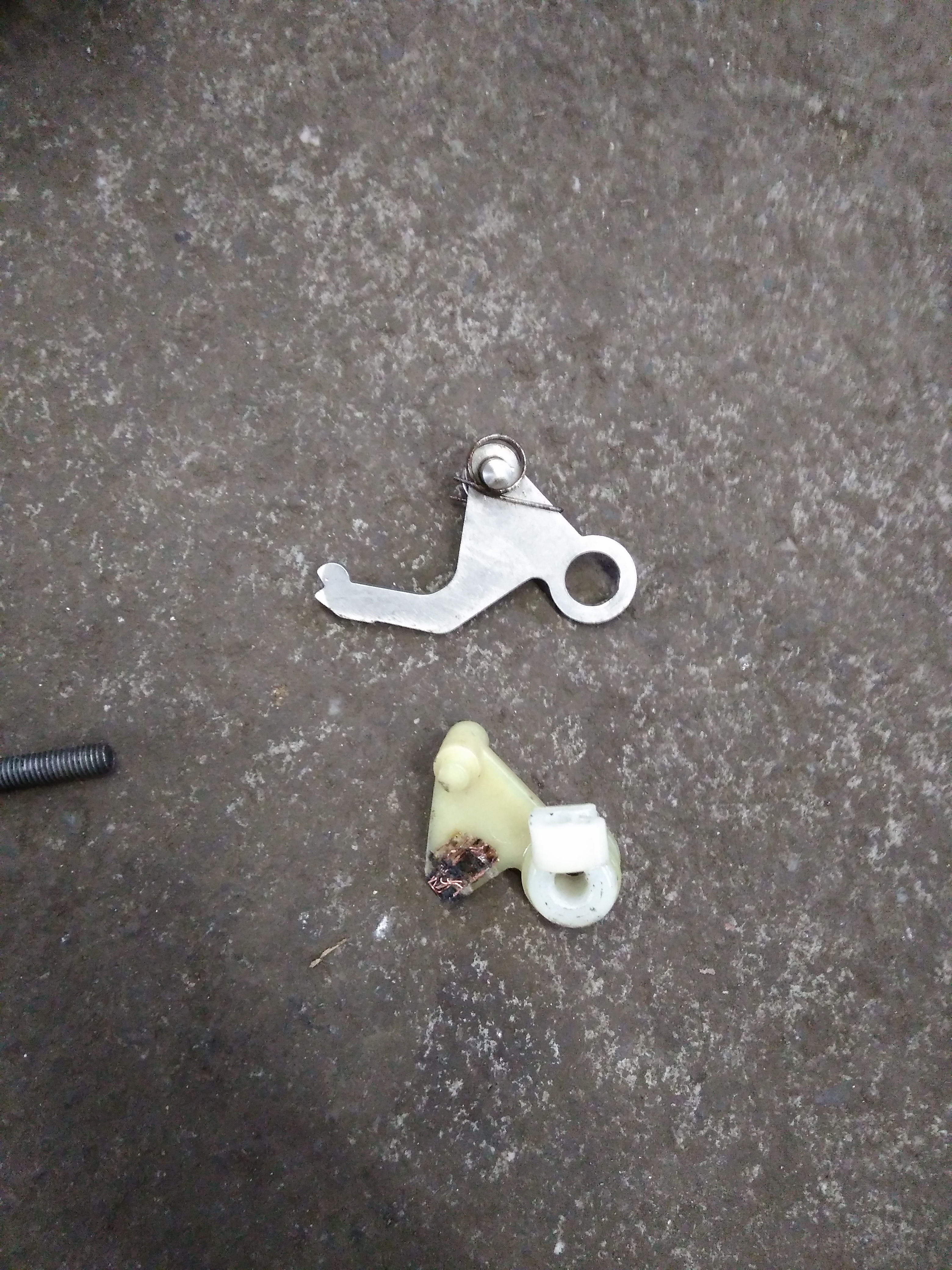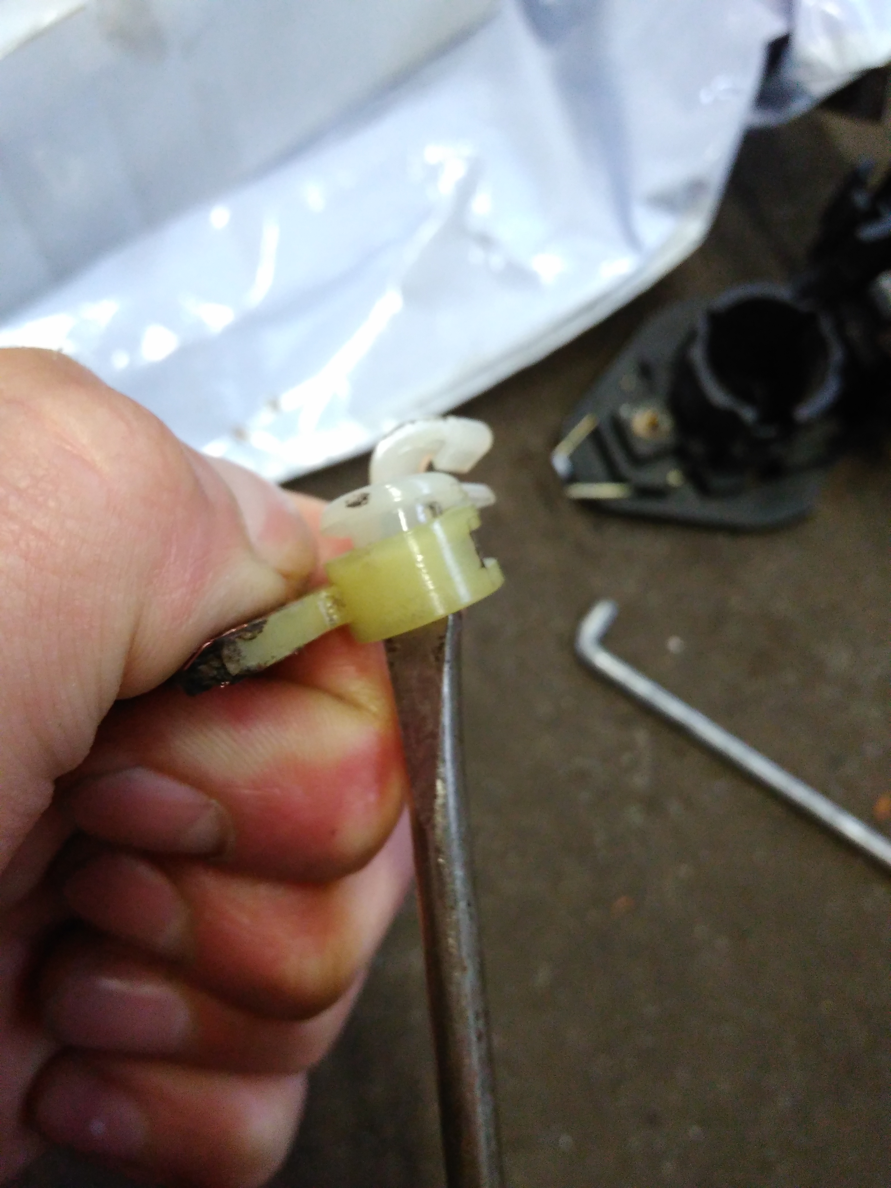7. Vyndat zlomenou pacičku opatrně i s pružinkou a bílým plastovým očkem - to budete ještě potřebovat. Já to vyndal šroubovákem. Bacha na prsty 8. Na novou pacičku vrátit bílé očko a pružinku - mně jako nemehlu to chvíli trvalo. Tady si zapamatujte, jak to tam bylo. Je potřeba to tam dát správnou stranou a poté "napnout" pružinku aby se sama vracela Rovnou to celé promazat. Je škoda, že ty pacičky neprodávají i s pružinkou. Moje už byly pěkně orezlé.