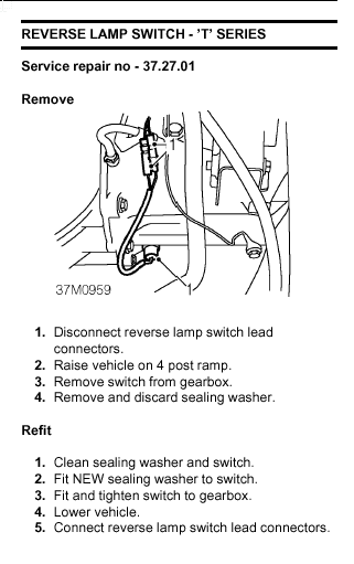 The reverse lamp switch is fitted to the manual gearbox and to the selector
