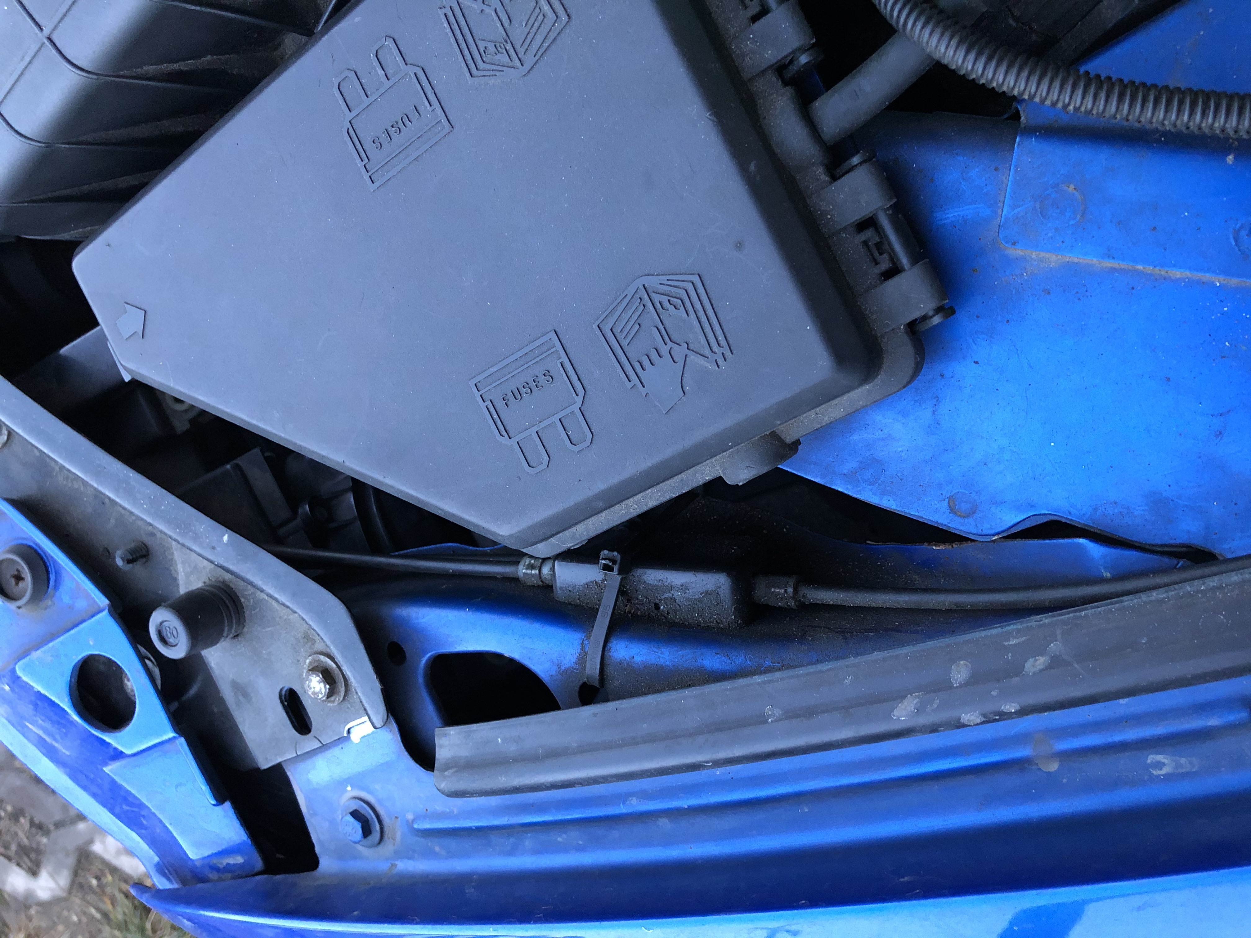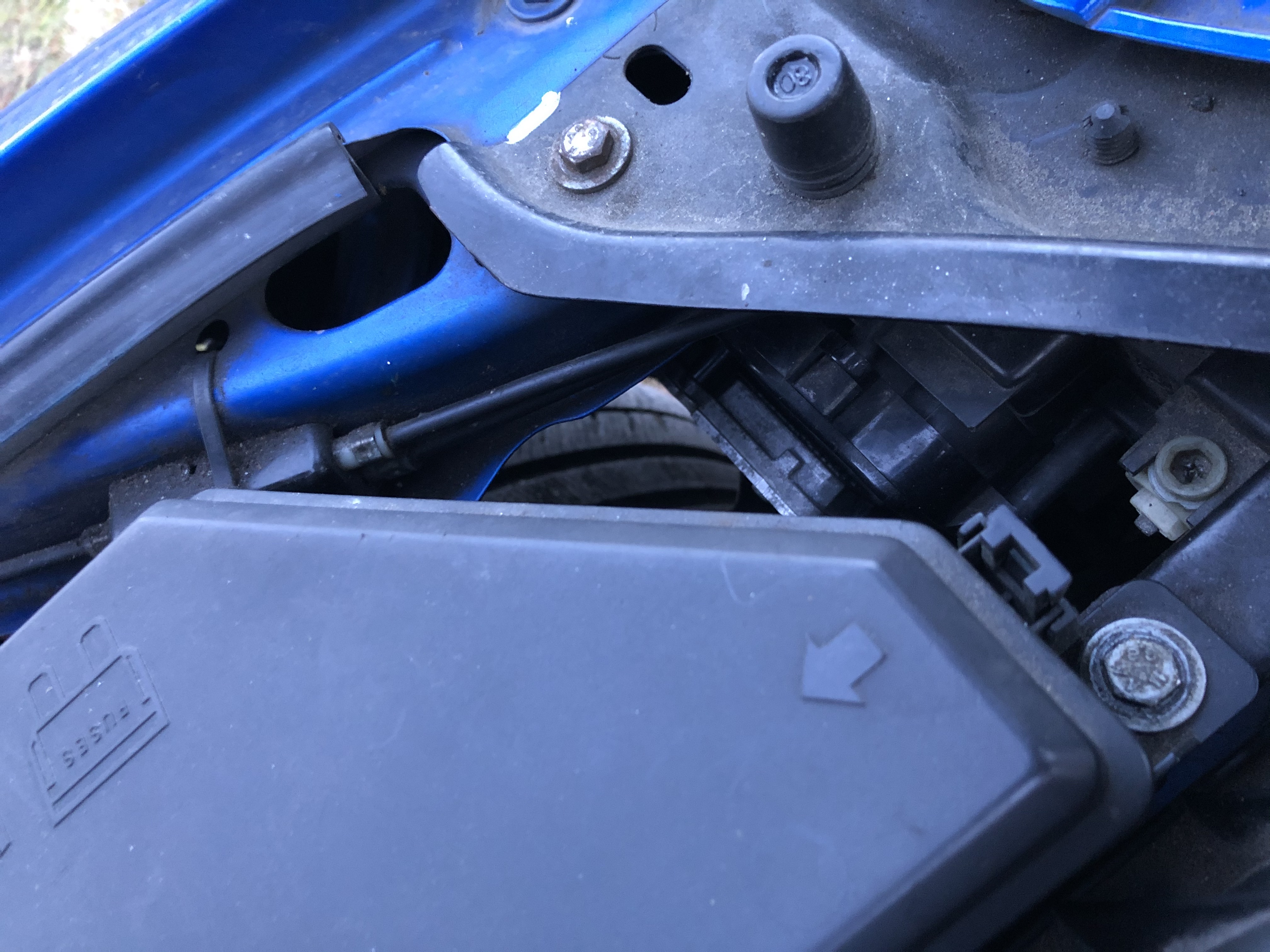 Tak jsem se k tomu konečně dostal. Kapotu jsem nakonec otevřel taháním za lanka tím mizerným prostorem v podběhu kola a za pomoci druhé osoby, která tlačila na kapotu. Nebylo tam nic prasklé, ale celá ta krabička vypadla z držáku v karoserii, tak jsem ji tam dal zpátky a pojistil stahovacíma páskama.