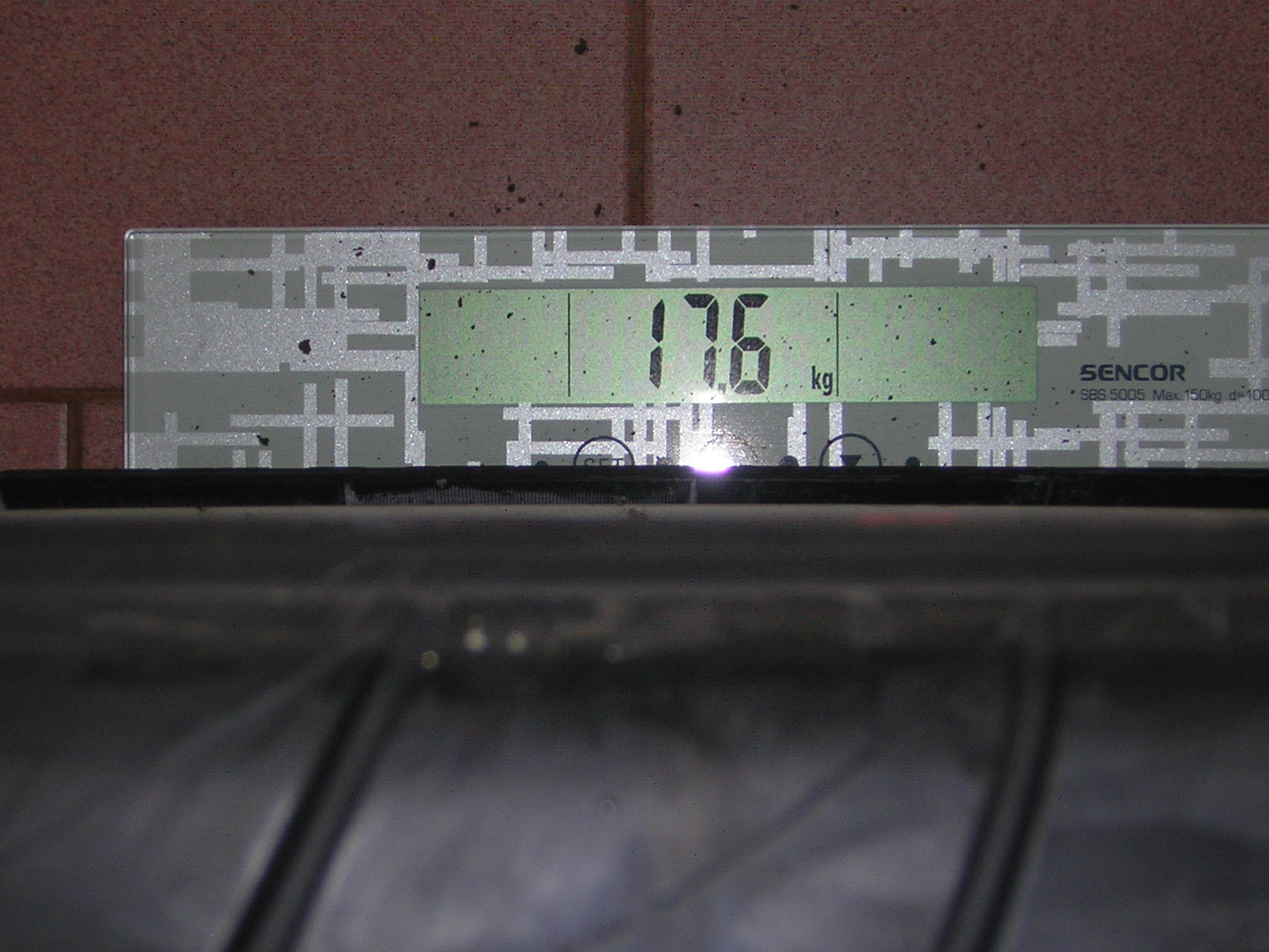 Jinak jsem zkusil obě kompletní kola zvážit a obě mají 17,6 kg, z toho guma váží 9,14 kg