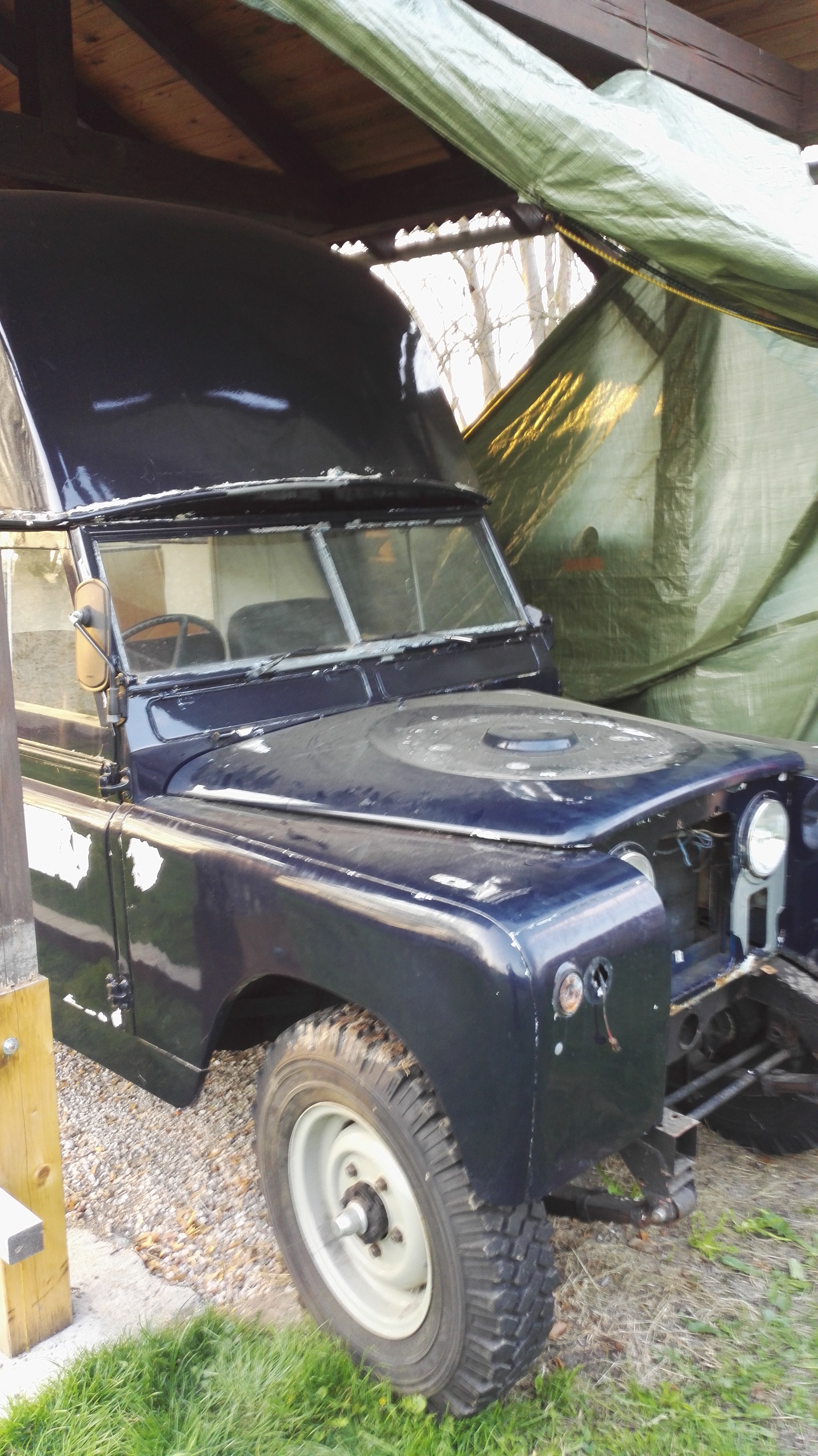 Je to Series 2a z 1969 kdy si Britská celni správa kvůli podvodům se "zelenou" naftou objednala 5 terénních vozů od Land Rover se speciální nástavbou od Dormobile jako pojízdné laboratoře na testování paliv. V roce 1975 se auta prodala na dražbě a to moje přestavěl Rakušan na obytnak. Ví se ještě o jednom z nich a ten je v predrenovacnim stavu na Aljašce kam s ním frajer dojel když si ho na dražbě v 1975 koupil. Ten má ještě i zachovány některé prvky v nastavbe ale jinak je na tom dost špatně. Snad se i tenhle kousek dočká záchrany. Nástavba je dřevěná kostra potažená Al plechem tak nevím jak dopadne. Já už mám nástavbu snad v pořádku a teď jsem se pustil do přední části vozu. Motor už vrčí, přední náprava repasovaná jen ji složit. ... No ještě rok dva a vyjedu