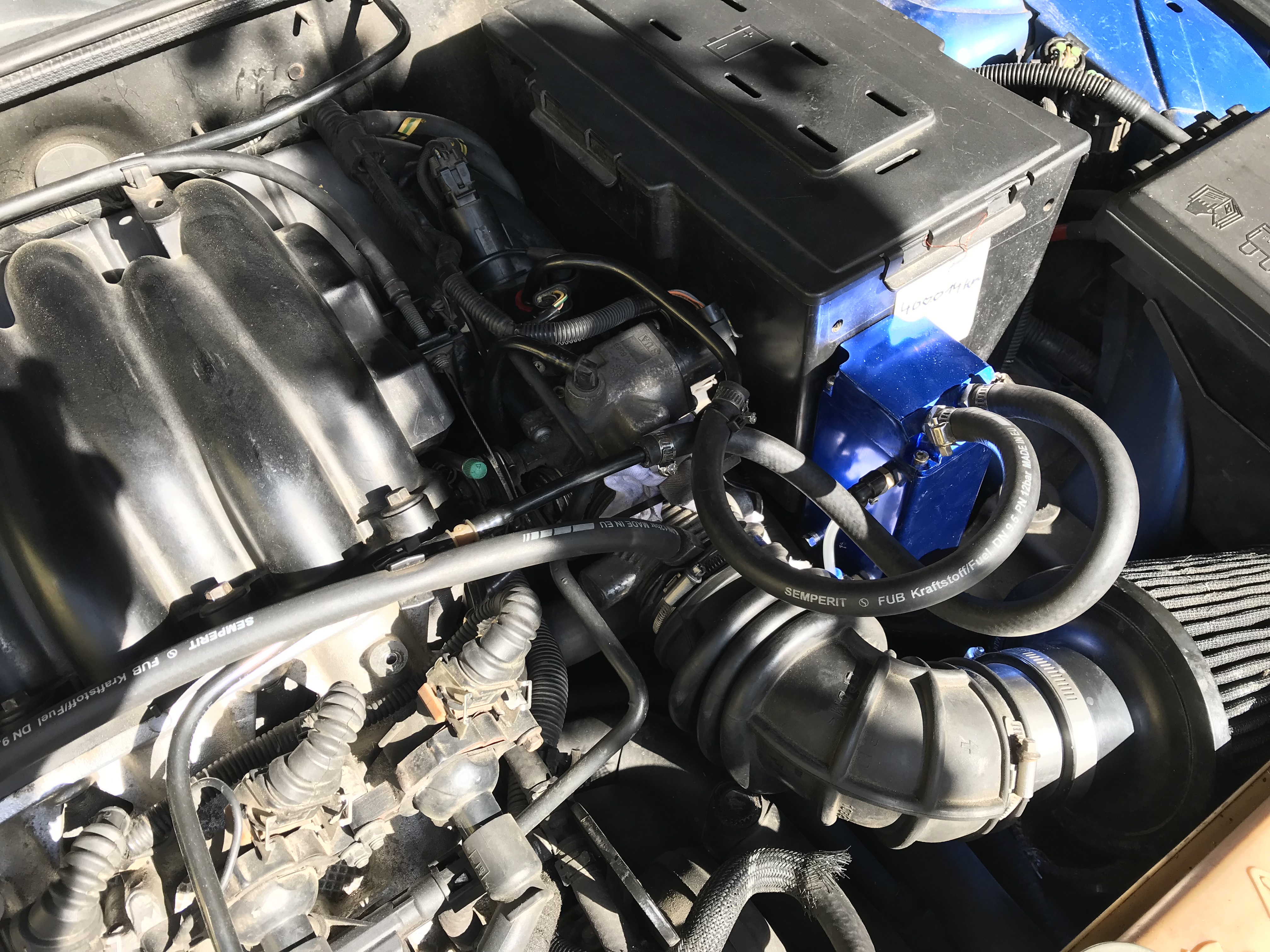 Dále jsem se odhodlal namontovat odlučovač. Je to takové heblo z Číny, myslím, že to uvnitř nemá ani síťku. Namontoval jsem to na tu tenčí větev. Tak uvidíme, jestli se tam něco chytí a jestli to třeba zamezí tomu, aby mi tekl olej sáním do filtru.