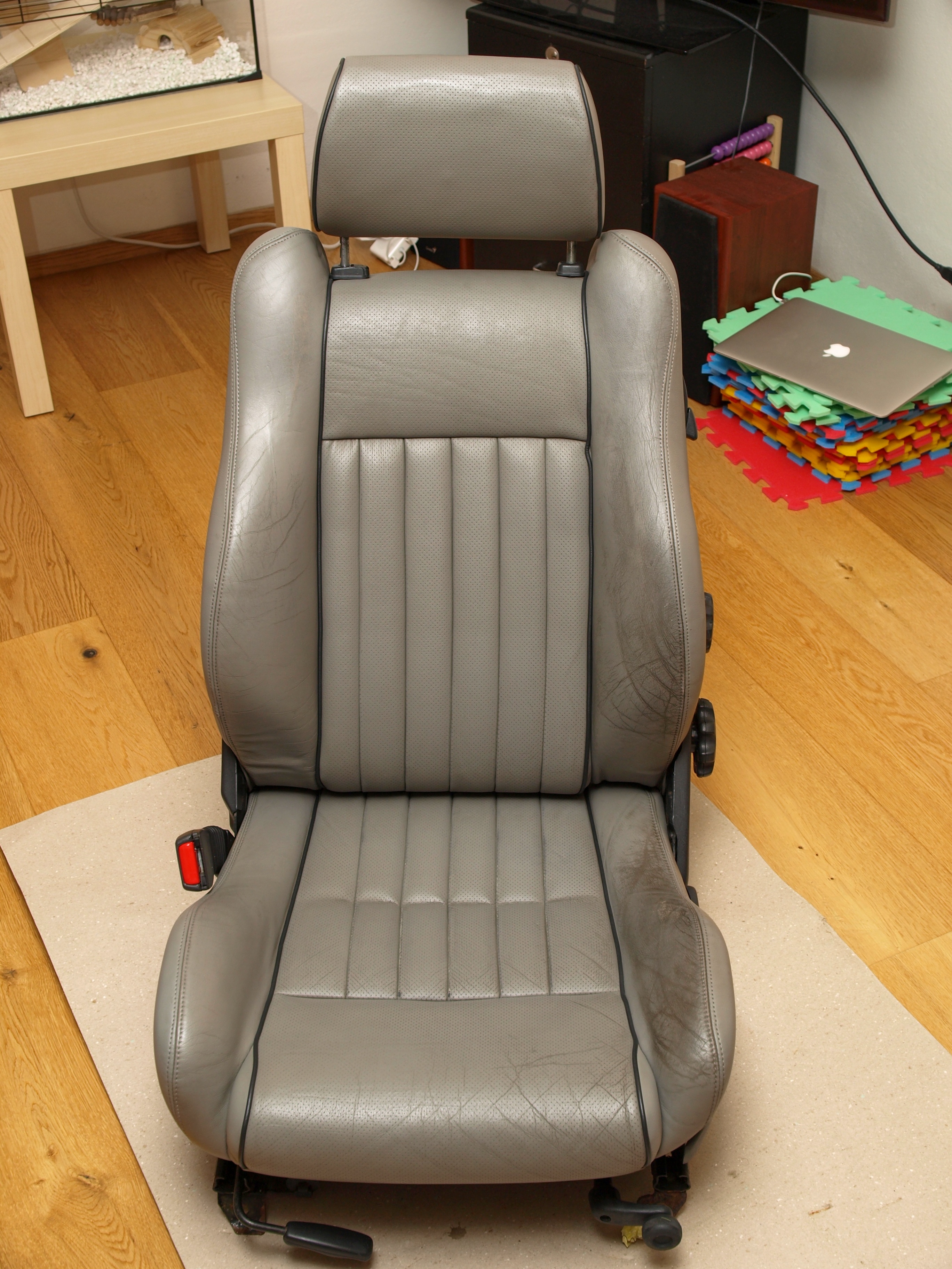 Stav sedaček... no... z kabria a původní majitelé asi totálně dlabali na to, že by se o kožené sedačky mělo nějak pečovat. Takže totální hnůj viz. foto. Nicméně pod tím humusem jsem neviděl nijak moc zásadních vad. Spolujezdcova sedačka má natrhlý kožený bok sedáku. Zadní sedák je propálený. Šoférova sedačka má kvůli nulové péči ošoupanou barvu. A jsou orezlé úchyty do podlahy. Klasika...