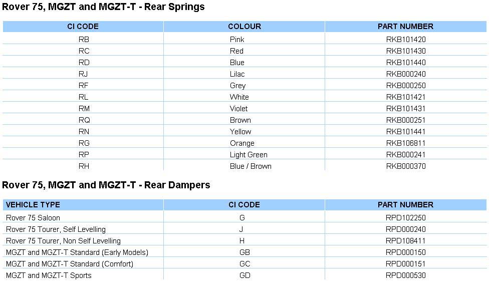 MG ZT and ZT-T front springs CI code Free Length diam. Spring rate Rover Module No, Spec