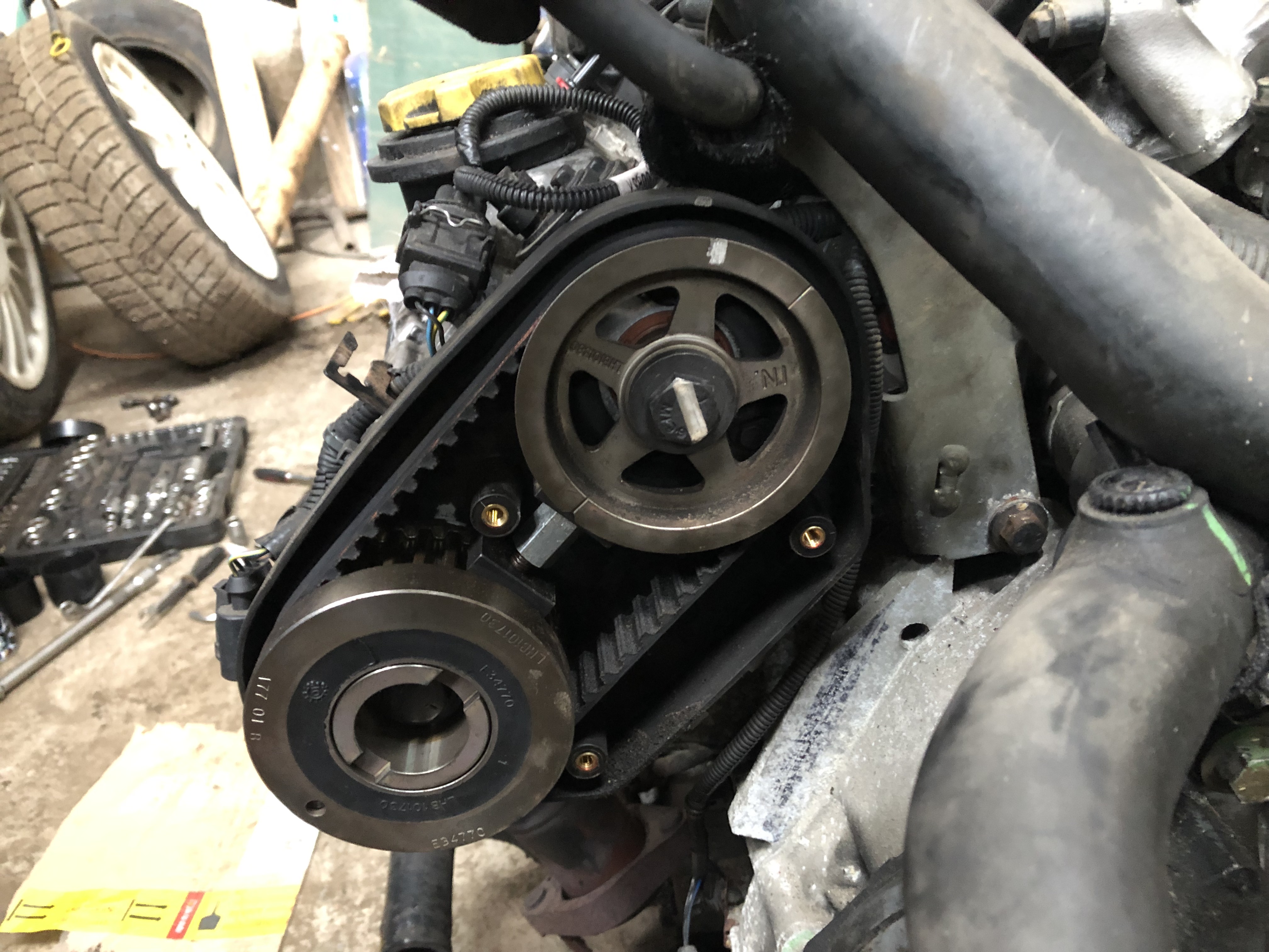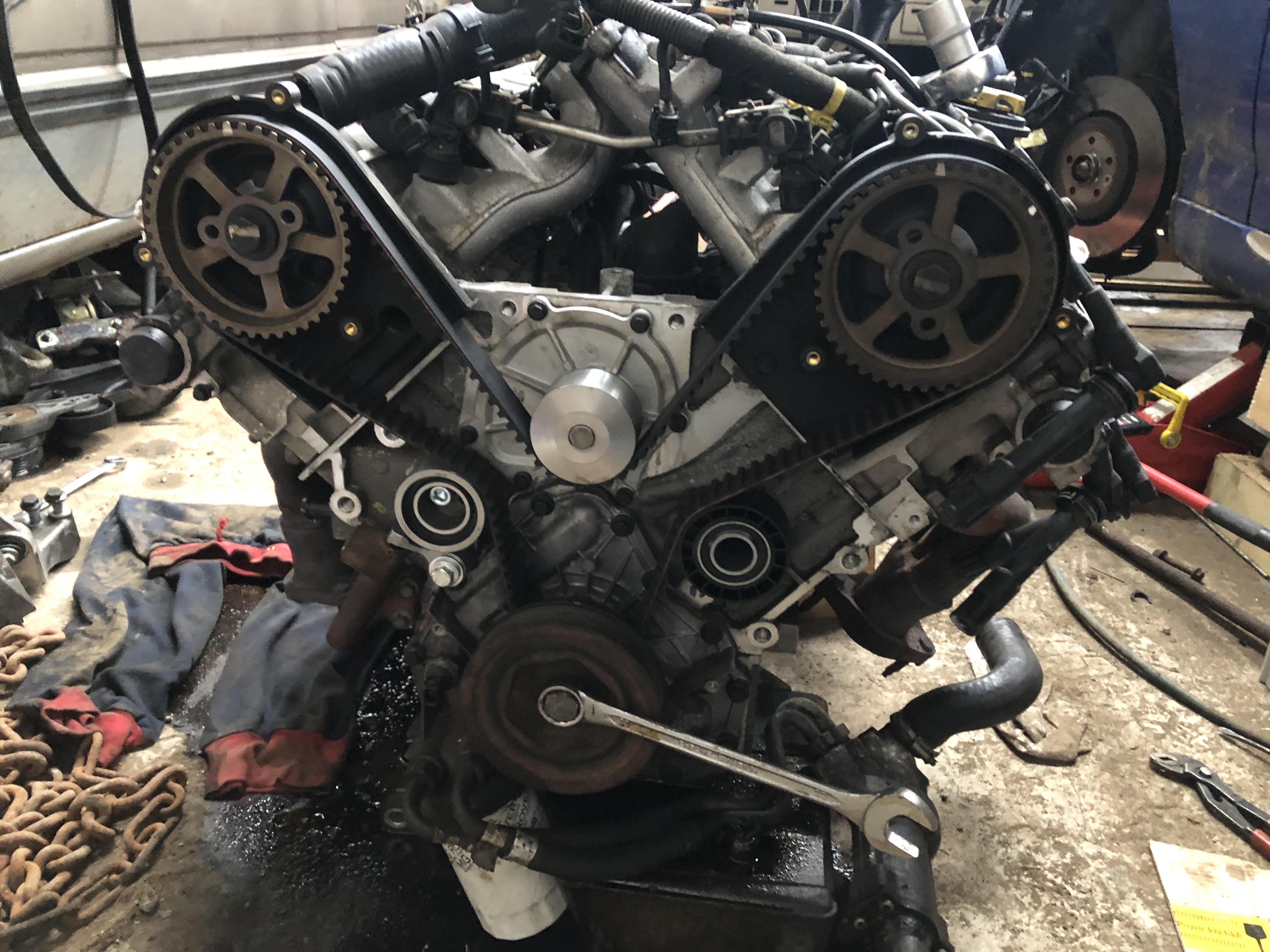 Někdy před vánočníma svátkama (naštěstí, páč jsem měl dovču) mi auto mimo oleje - na což už jsem byl zvyklej - začalo žrát i vodu. Že ji žralo, bych nějak přežil, ale že se mi při startování stalo, že se motor zastavil, kvůli vodě ve válci, už bylo moc. Takže jediný řešení přicházelo v úvahu - rabovat na orgány RHD ZT. Co se dá dělat... Odstěhoval jsem auta ke švárovi do dílny kde má kanál a žirafu, nakoupil díly na rozvody, spojkový ložisko (pro jistotu)a pustil se do toho. Motor z dárce ven byla (celkem) pohoda, z mýho to bylo horší kvůli elektrice, protože je na ní připojený LPG, takže nejde tak jednoduše odpojit zásuvku od ECU a od pojistek a všechno zůstane na motoru - musel jsem všechno odpojit z motoru a celej svazek nachat viset přez blatník... No motor byl venku, pustil jsem se do rozvodů, což naštěstí na motoru venku byla celkem pohoda... nová vodní pumpa, napínací i vodící kladka, všechny řemeny... Přípravky na rozvody mám půjčený od Jirky (Djmicho). Všechno klaplo, všechno se točilo (důležitá informace pro další pokračování příběhu...).
