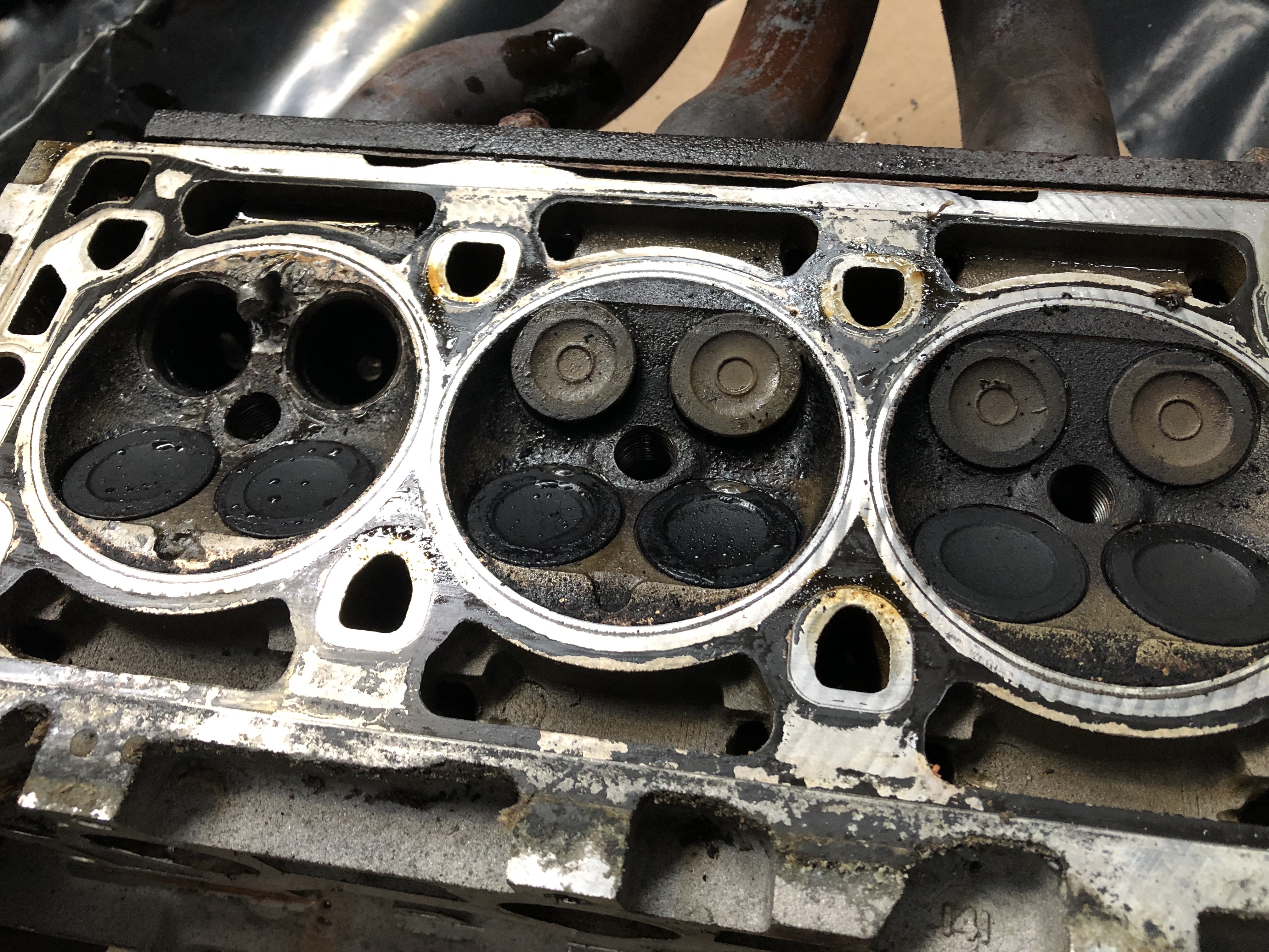 Neděle dopoledne zalepit, dodělat všechno na autě (kapota a všechny ty kraviny kolem). Jedu ho projet. Bílá pára z vejfuku pořád, ale co mně děsí víc, je modrej kouř při sešlápnutí plynu. Volám Mirdovi, říká že to je normální, chce to projet víc, aby všechno z toho vejfuku šlo ven. Ok, sbalím to, švára jede za mnou a valíme domů. Po pár kilometrech kouře se jdu podívat do motoru. Hadice jsou jak beton, něco je špatně. Vrátíme se do dílny, opatrně odpustím tlak, když pak nastartuju s otevřeným víčkem, všechna voda hned lítá ven (před tím byl dobře odvzdušněnej). Vypadá to že jak motor nějakou dobu stál suchej, asi šlo do kytek těsnění pod makovicí. Co se dá dělat. Tak motor zase ven, na autě se mi fakt makovice sundávat nechtělo... Takže hlavy dolů, objednat komplet sadu těsnění, když už jsou hlavy dole, budou se brousit.